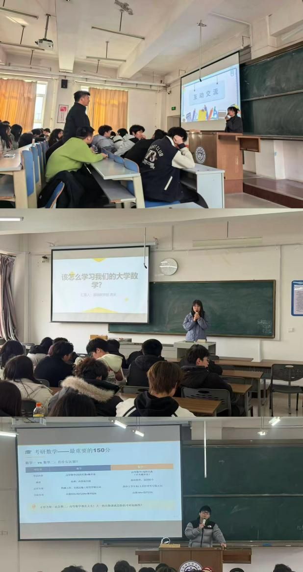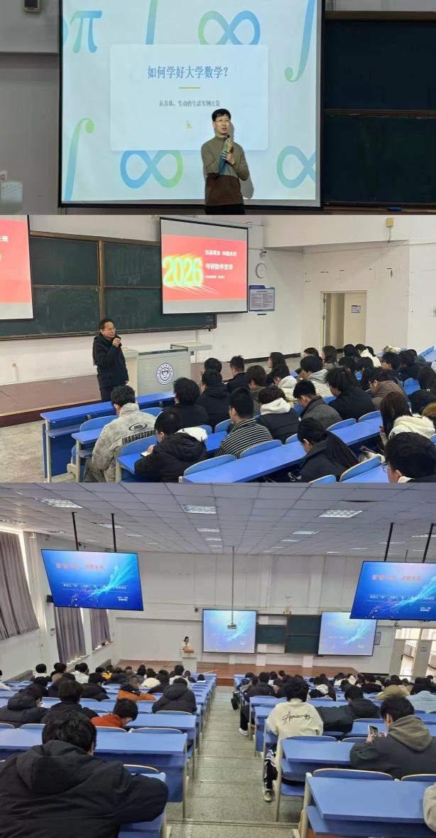 讲座紧密结合我校学生学习特点与各专业考研数学需求精准施策,实现本科数学学习与考研数学备考的深度融合、无缝衔接。土木工程学院专场,韩志涛以趣味提问开启备考动员,引导新生克服数学学习畏难情绪,树立及早规划、稳步备考的意识。市政与环境工程学院专场,周末结合往届考研典型案例与核心题型得分数据,精准划定数学备考重点内容,提醒学生规避碎片化学习、盲目刷题等备考误区。信息与控制工程学院专场,张国林直面学生认知误区,纠正“数学学习靠天赋”等错误观念,明晰考研数学在升学考试中的关键作用;尹莉精准剖析考研数学与本科数学的学习差异,打破“大四才开始备考”的固有定式,为学生量身打造大学四年考研数学备考路线图,分阶段讲解各时期复习方法与核心目标。机械工程学院专场,邹雨椿深入分析当下考研数学整体形势,细致讲解数学一、数学二试卷结构与考查侧重,提出科学系统的“三步走”备考策略;陈东宇为学生量身定制择校参考策略,分享数学高效学习实用技巧,同步梳理各阶段备考核心要点。